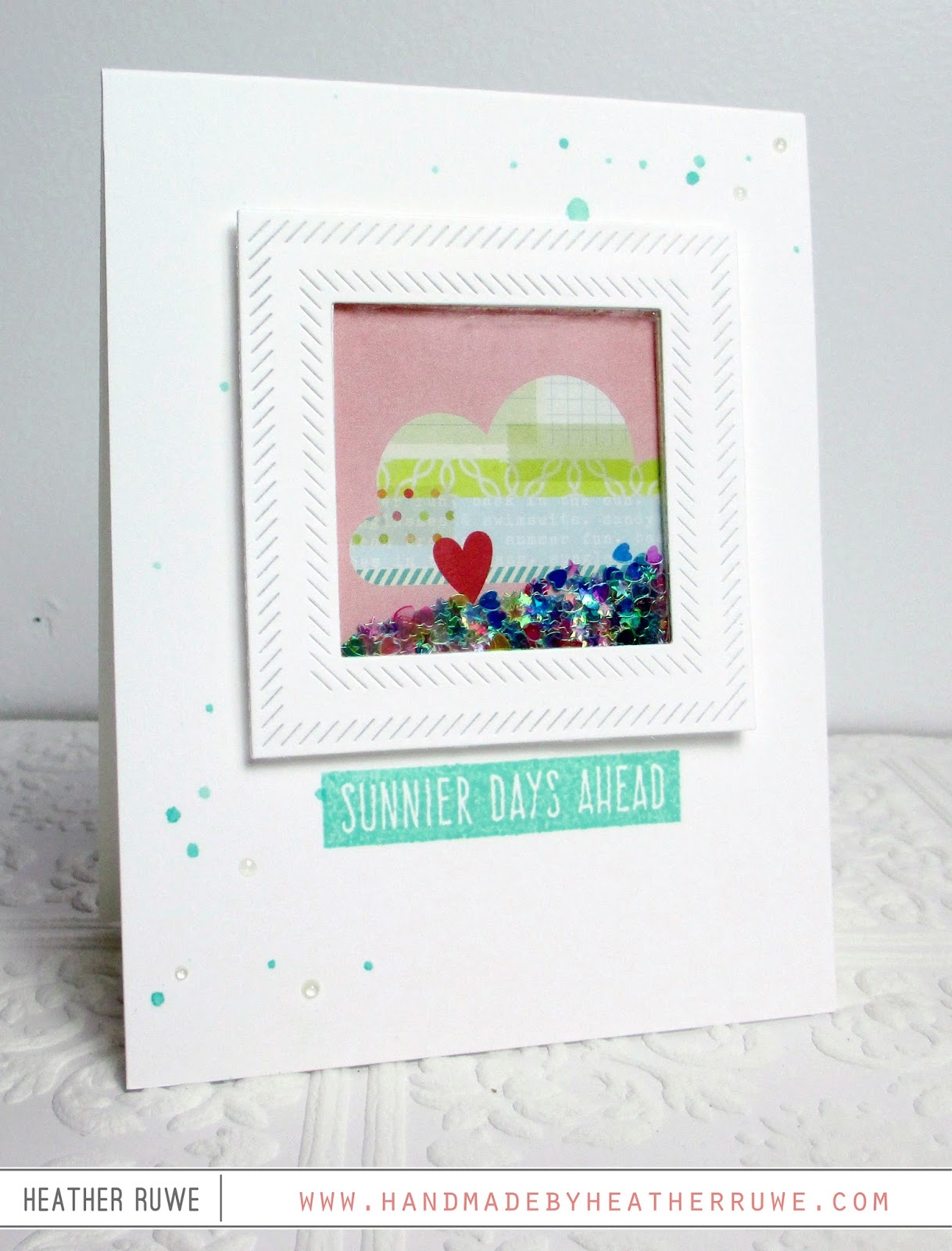 The paper pad has a few sheets with small squares of patterns. I chose a cloud one and used that for inside my shaker window. I used THIS die to frame it out, stamped the greeting in THIS ink, and added a few drops of color along with some glossy accent dots to finish off the card.