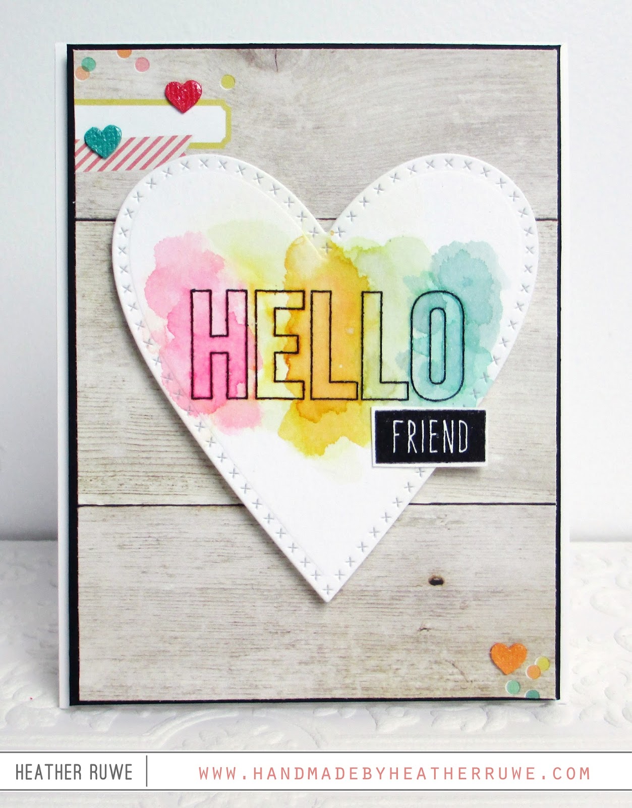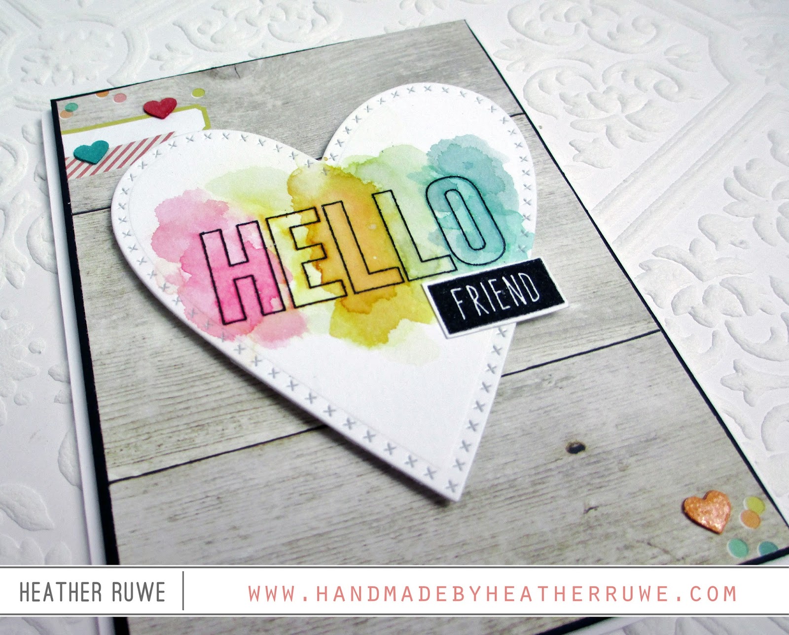I started by stamping the Hello sentiment from the kit’s stamp set using THIS ink on to a piece of THIS paper. I heat embossed it with clear embossing powder. I added water to several different distress ink colors and added the watercolor around each letter. The distress colors matched the patterned paper perfectly! I die-cut the piece using the largest heart from THIS die set. I adhered it to a piece of patterned paper from the kit and added a sentiment stamped with THIS ink and then clear heat embossed.