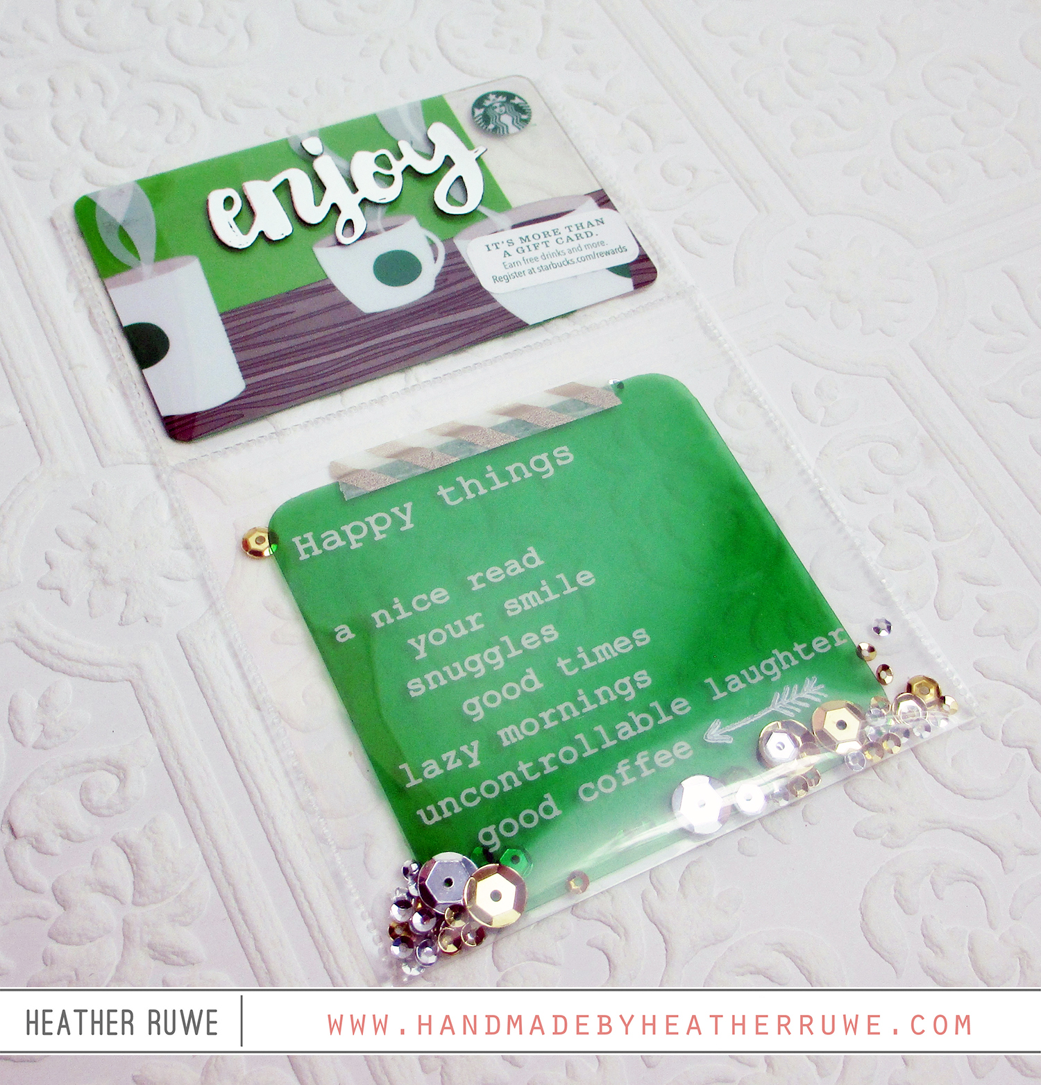 THIS ink to draw attention to the “good coffee” sentiment at the bottom of the green acetate card. This helps tie in the coffee theme.