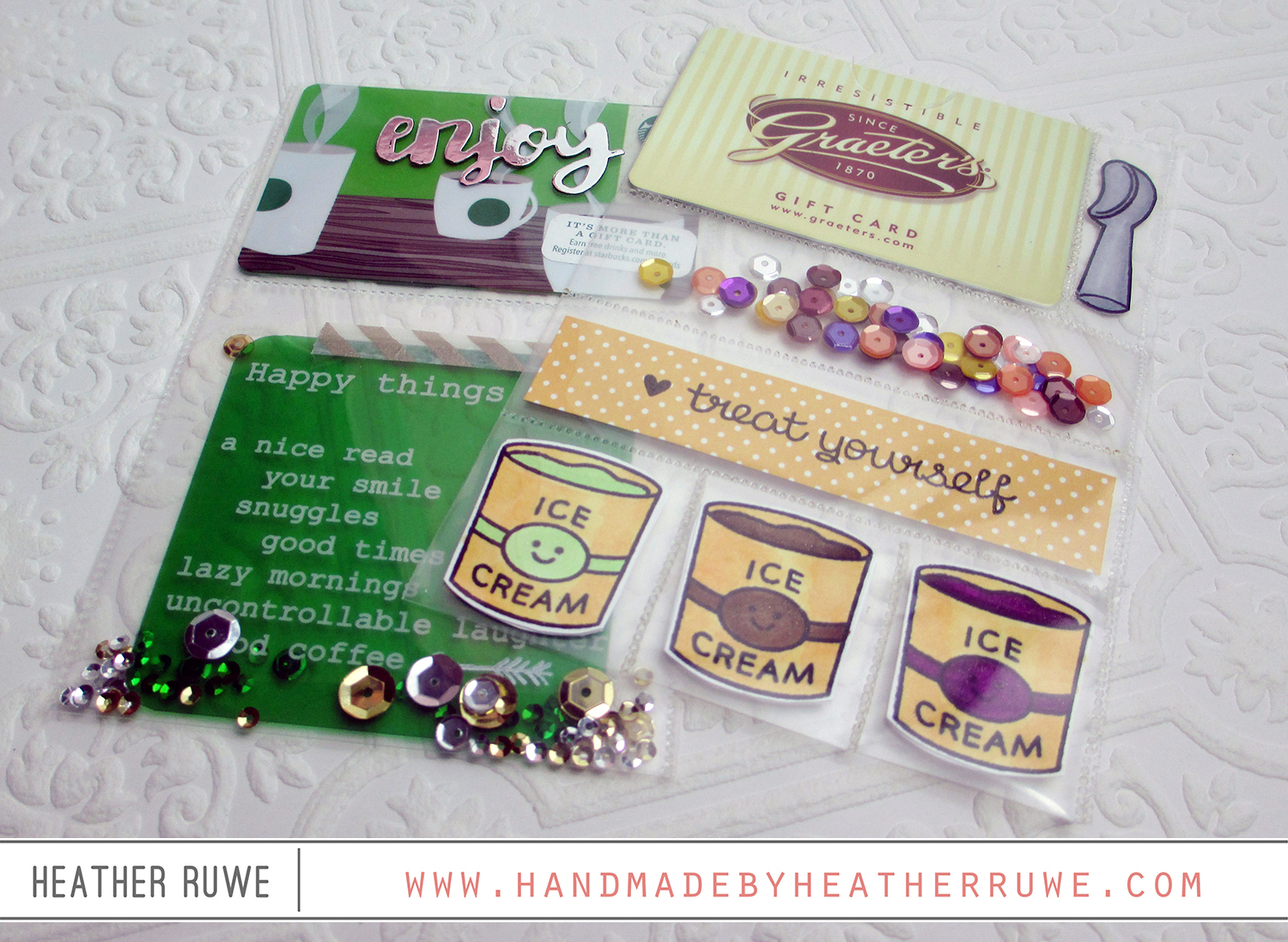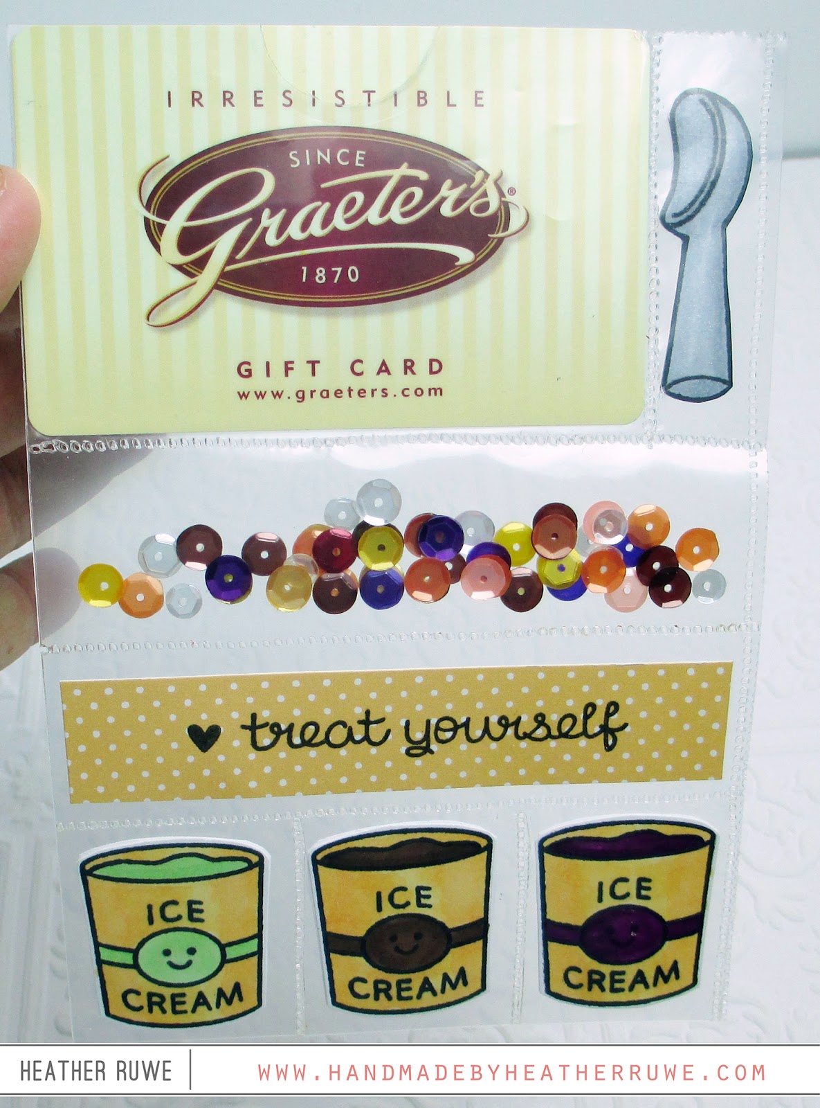 I stamped images from THIS and THIS stamp set from Lawn Fawn, colored them with some Spectrum Noir Markers. I used one of THESE stamp pockets and laid the ice cream images in the bottom of the pocket. Once I was happy with the spacing I began to fuse the sections, creating a pocket for each image to sit in. I continued this up the card adding a pocket for my sentiment, sequins, ice cream scoop image, and of course the gift card.