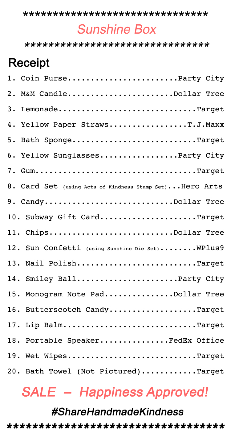 Remember, there are no rules when creating Sunshine Boxes. You can go elaborate or really simple. It’s the thought that counts! I hope this inspires you to create a sunshine box. Remember to use #sharehandmadekindness when sharing on social media.